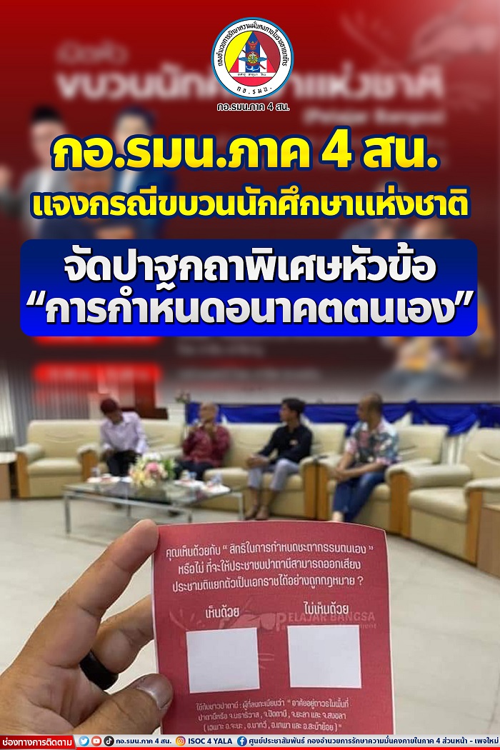 จากกรณีดังกล่าว กองอำนวยการรักษาความมั่นคงภายในภาค 4 ส่วนหน้า ได้เข้าทำการตรวจสอบข้อเท็จจริงและข้อมูลเชิงลึกอย่างรอบด้านแล้วพบว่าขบวนการนักศึกษาแห่งชาติ (pelajar Bangsa) เป็นองค์กรเคลื่อนไหวทางการเมืองจัดตั้งขึ้นจากการรวมตัวของนิสิตนักศึกษาในพื้นที่จังหวัดชายแดนภาคใต้ และได้เคลื่อนไหวเรียกร้องในเรื่องสิทธิในการกำหนดใจตนเอง (right to self determination) ทั้งในและนอกพื้นที่จังหวัดชายแดนภาคใต้มาอย่างต่อเนื่อง และต่อมาได้เปลี่ยนชื่อองค์กรเป็นขบวนการนักศึกษาแห่งชาติเมื่อ 31 พฤษภาคม 2566 โดยมี นายอิรฟาน อุมา เป็นประธานขบวนการนักศึกษาแห่งชาติคนปัจจุบัน สำหรับการจัดกิจกรรมเมื่อ 7 มิถุนายน 2566 พบว่าเป็นการเปิดตัวขบวนการนักศึกษาแห่งชาติ โดยมีนักการเมือง, สมาชิกพรรคการเมือง, นักวิชาการรวมทั้งเครือข่ายนักศึกษาเข้าร่วมและสนับสนุนกิจกรรมจำนวนหนึ่ง โดยจากการตรวจสอบรายละเอียดของกิจกรรมพบว่ามีหลายประเด็นที่ล่อแหลมหมิ่นเหม่และอาจเข้าข่ายต่อการละเมิดหลักกฏหมาย โดยขอยืนยันว่าภาครัฐได้ส่งเสริมและสนับสนุนสิทธิและเสรีภาพในการแสดงออกและแสดงความคิดเห็นทางการเมืองภายใต้ระบอบประชาธิปไตยอันมีพระมหากษัตริย์ทรงเป็นประมุขของปวงชนชาวไทยทุกเชื้อชาติ ทุกศาสนา โดยไม่เลือกปฏิบัติทางเชื้อชาติในทุกรูปแบบ แต่การแสดงออกดังกล่าวจะต้องไม่ไปละเมิดต่อหลักกฏหมายและบูรณภาพแห่งดินแดนที่ได้กำหนดไว้ในรัฐธรรมนูญแห่งราชอาณาจักรไทยที่ได้ระบุไว้ว่า ”ประเทศไทยเป็นราชอาณาจักรอันหนึ่งอันเดียวจะแบ่งแยกมิได้” ทั้งนี้ ขอยืนยันว่าการลงประชามติเพื่อแยกตัวเป็นเอกราช ไม่สามารถกระทำได้ เพราะเป็นการละเมิดกฏหมายและบูรณภาพแห่งดินแดนและเป็นภัยต่อความมั่นคงแห่งรัฐ โดยปัจจุบันเจ้าหน้าที่อยู่ระหว่างการรวบรวมพยานหลักฐานและตรวจสอบพฤติกรรมของผู้ที่มีส่วนเกี่ยวข้องกับกิจกรรมในครั้งนี้ เพื่อดำเนินการตามอำนาจหน้าที่ที่ได้กำหนดไว้ตามความเหมาะสมต่อไป
