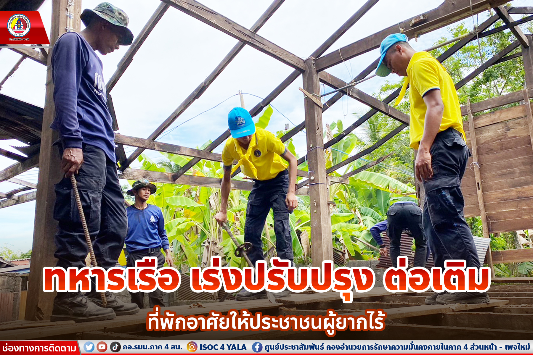 หน่วยเฉพาะกิจนาวิกโยธิน กองทัพเรือ โดย กองร้อยทหารพรานนาวิกโยธินที่ 7 หน่วยเฉพาะกิจทหารพรานนาวิกโยธิน กองทัพเรือ กำลังพลจิตอาสา ดำเนินการขนย้าย รื้อถอนที่พักอาศัย ณ บ้านเลขที่ 47 บ้านต้นตาล หมู่ที่ 2 ตำบลจอเบาะ อำเภอยี่งอ จังหวัดนราธิวาส เพื่อปรับปรุงต่อเติมที่พักอาศัยให้กับ นายอาหะมะ ยือลาบอ ซึ่งเป็นผู้ยากไร้และได้รับการคัดเลือกในด้านการพัฒนาคุณภาพชีวิต เพื่อเร่งให้ครอบครัว นายอาหะมะ ยือลาบอ ได้มีที่พักอาศัยมีความมั่นคง แข็งแรง ปลอดภัย ซึ่งเป็นการช่วยเหลือและยกระดับคุณภาพชีวิตความเป็นอยู่ของผู้ยากไร้ให้ดียิ่งขึ้น และบรรเทาความเดือนร้อนเบื้องต้น อีกทั้งยังเป็นการสร้างสัมพันธ์อันดีระหว่างเจ้าหน้าที่ทหารกับประชาชนในพื้นที่