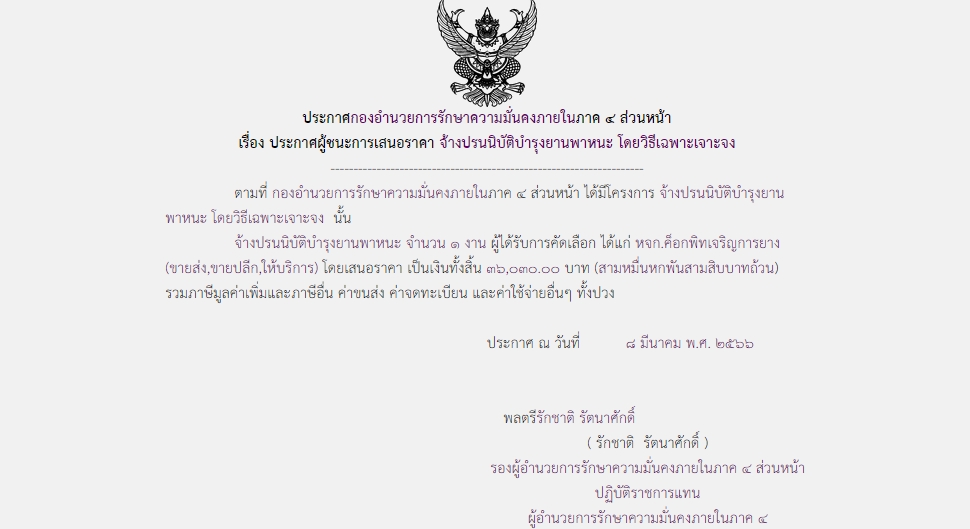 ประกาศผู้ชนะการเสนอราคา จ้างปรนนิบัติบำรุงยานพาหนะ โดยวิธีเฉพาะเจาะจง