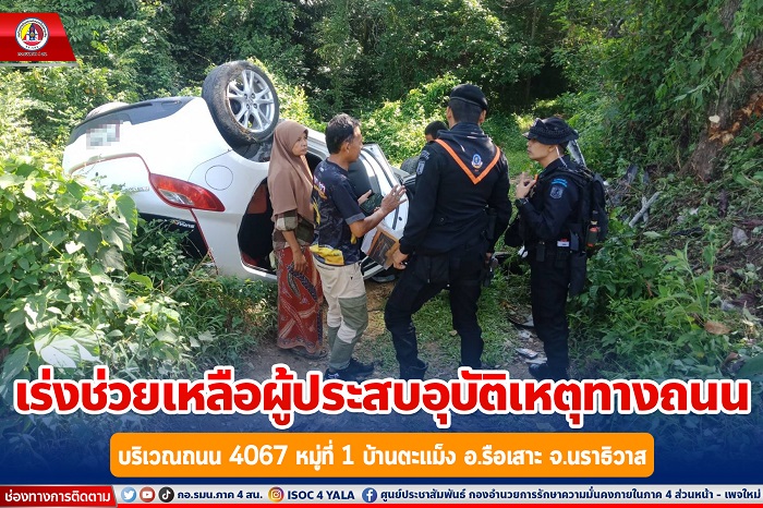 เมื่อวันที่ 12 มิถุนายน 2566 เวลา 07.45 น. กองร้อยทหารพรานที่ 4613 หน่วยเฉพาะกิจกรมทหารพรานที่ 46 เข้าไปช่วยเหลือ รถเก๋งเสียหลักพลิกคว่ำ บริเวณถนน 4067 หมู่ที่ 1 บ้านตะแม็ง อำเภอรือเสาะ จังหวัดนราธิวาส จึงได้นำกำลังพล เข้าช่วยเหลือในที่เกิดเหตุ ซึ่งที่เกิดเหตุพบ รถเก๋ง TOYOTA Yaris 4 ประตู สีขาว ทะเบียน กฉ 5845 ปัตตานี พลิกคว่ำอยู่บริเวณเชิงสะพาน มีผู้ได้รับบาดเจ็บ จำนวน 3 ราย คือ 1.นายซารัฟ เจ๊ะโก๊ะ อายุ 33 ปี อยู่บ้านเลขที่ 57 หมู่ที่ 5 บ้านไอจะนะ ตำบลโคกสะตอ อำเภอรือเสาะ จังหวัดนราธิวาส (ผู้ขับ) 2.น.ส.อารีซะห์ กูเตะ อายุ 29 ปี 3.ด.ญ.ซีรีน เจ๊ะโก๊ะ อายุ 9 ขวบ ทั้ง 3 ราย ได้รับบาดเจ็บและได้นำตัวส่งโรงพยาบาลรือเสาะ