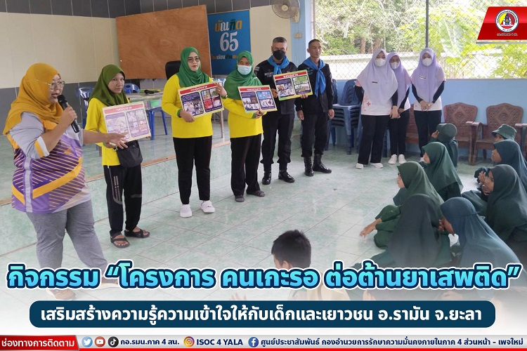 วันที่ 14 มิถุนายน 2566 ที่ โรงเรียนบ้านพะปูเงาะ หมู่ที่ 4 ตำบลเกะรอ อำเภอรามัน จังหวัดยะลา ชุดปฏิบัติการเสริมสร้างความเข้าใจ กองร้อยทหารพรานที่ 4116 หน่วยเฉพาะกิจกรมทหารพรานที่ 41 พร้อมด้วย นาย อุสมาน อาแซ ผู้อำนายการโรงเรียนบ้านพะปูเงาะ, คณะบุคลากรทางการศึกษา, นักเรียน และหน่วยงานในพื้นที่ ร่วมกิจกรรม “โครงการ คนเกะรอ ต่อต้านยาเสพติด” ได้รับการสนับสนุนโดย กองทุนหลักประกันสุขภาพตำบลเกะรอ ( สปสช./องค์การบริหารส่วนตำบลเกะรอ อำเภอรามัน จังหวัดยะลา ) เพื่อเสริมสร้างความรู้ความเข้าใจให้กับเด็กและเยาวชน ได้มีภูมิคุ้มกันด้านการป้องกันและห่างไกลยาเสพติด อีกทั้งยังลดปัญหายาเสพติดให้หมดสิ้นไปจากชุมชนในพื้นที่อีกด้วย
