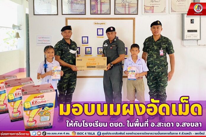 กองพันพัฒนาที่ 4 กองพลพัฒนาที่ 4 ลงพื้นที่อำเภอสะเดา จังหวัดสงขลา เพื่อมอบผลิตภัณฑ์นมผงอัดเม็ดเมจิ จียู ฟอร์มูล่า โกลด์ อีซี่คิวบ์ 3 จากบริษัท ไทยเมจิ ฟู๊ด จำกัด ซึ่งหน่วยได้รับการแจกจ่ายจากกองทัพบก เพื่อนำไปมอบให้กับโรงเรียนตำรวจตระเวนชายแดน จำนวน 5 โรงเรียน ซึ่งโรงเรียนดังกล่าวเป็นโรงเรียนในโครงการทหารพันธุ์ดี ในพระบรมราชูปถัมภ์ สมเด็จพระกนิษฐาธิราชเจ้ากรมสมเด็จพระเทพรัตนราชสุดาฯ สยามบรมราชกุมารี ซึ่งเป็นโรงเรียนที่อยู่ในพื้นที่รับผิดชอบของหน่วย ทั้งนี้เพื่อให้เด็กนักเรียนได้มีอาหารเสริมที่รับประทานง่าย อร่อย และมีประโยชน์ต่อร่างกาย