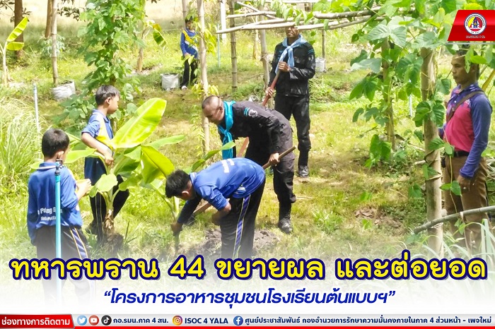 เมื่อวันที่ 16 มิถุนายน 2566 หน่วยเฉพาะกิจกรมทหารพรานที่ 44 จัดกำลังพล ชุดปฏิบัติการเสริมสร้างความเข้าใจ ร่วมกับ บุคลากรทางการศึกษา และยุวเกษตรฯ ช่วยกันพัฒนาปรับปรุงพื้นที่แปลงเกษตรฯ โรงเรียนบ้านป่าทุ่ง บ้านป่าทุ่ง หมู่ที่ 4 ตำบลบางเก่า อำเภอสายบุรี จังหวัดปัตตานี เพื่อเตรียมพื้นที่ในการดำเนินงานด้านเกษตรชุมชนแบบฟื้นฟู ภายใต้ “โครงการอาหารชุมชนโรงเรียนต้นแบบ” (แบบขยายผล) ตามหลักปรัชญาเศรษฐกิจพอเพียง เพื่อมุ่งเน้นให้พี่น้องประชาชนในพื้นที่สามารถพึ่งพาตนเองได้ อีกทั้งเป็นแหล่งเรียนรู้ให้กับเยาวชนในการศึกษา