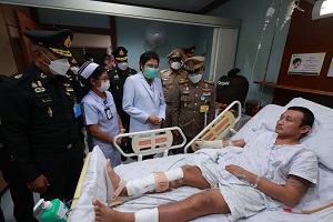 ต่อจากนั้น องคมนตรี เดินทางไปยังโรงพยาบาลสงขลานครินทร์ อำเภอหาดใหญ่ จังหวัดสงขลา เพื่อเชิญสิ่งของพระราชทาน มอบให้แก่อาสาสมัครทหารพราน ณัฐพล อุปาทา เจ้าหน้าที่ชุดปฏิบัติการพิทักษ์ สังกัดกองร้อยทหารพรานที่ 3006 หน่วยเฉพาะกิจกรมทหารพรานที่ 30 ซึ่งได้รับบาดเจ็บจากเหตุคนร้ายลอบวางระเบิดขณะปฏิบัติหน้าที่ ที่บริเวณหมู่ 3 บ้านเงาะกาโป อำเภอบันนังสตา จังหวัดยะลา เมื่อวันที่ 12 พฤษภาคม 2566 และอาสาสมัครทหารพรานอารือรี บูงอตันหยง เจ้าหน้าที่หน่วยเฉพาะกิจกรมทหารพรานที่ 48 ซึ่งได้รับบาดเจ็บจากเหตุร้ายรอบวางระเบิด ชุดปฏิบัติการพิทักษ์พื้นที่ กองร้อยทหารพรานที่ 4812 ขณะลาดตระเวนเส้นทาง บริเวณบ้านปาเร๊ะลูโป๊ะ หมู่ที่ 9 ตำบลมะรือโบออก อำเภอเจาะไอร้อง จังหวัดนราธิวาส เมื่อวันที่ 10 มิถุนายน 2566
