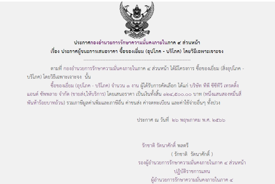 ประกาศผู้ชนะการเสนราคา ซื้อของเยี่ยม (อุปโภค – บริโภค) โดยวิธีเฉพาะเจาะจง