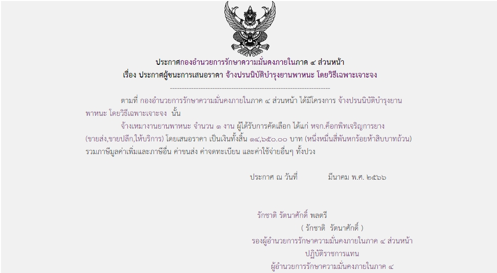 ประกาศผู้ชนะการเสนอราคา จ้างปรนนิบัติบำรุงยานพาหนะ โดยวิธีเฉพาะเจาะจง