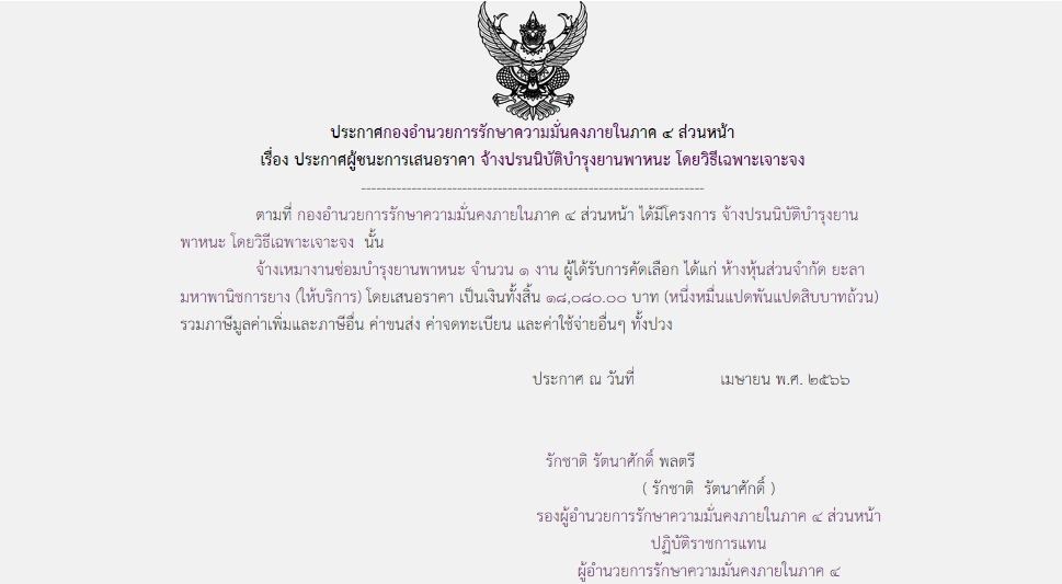 ประกาศผู้ชนะการเสนอราคา จ้างปรนนิบัติบำรุงยานพาหนะ โดยวิธีเฉพาะเจาะจง