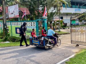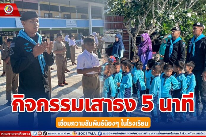 หน่วยเฉพาะกิจกรมทหารพรานที่ 44 จัดกำลังพลชุดปฏิบัติการเสริมสร้างความเข้าใจ ลงพื้นที่เข้าพบปะพูดคุยพัฒนาสัมพันธ์ กับบุคลากรทางการศึกษา ในพื้นที่ 4 อำเภอ ประกอบด้วย อำเภอสายบุรี, อำเภอกะพ้อ, อำเภอทุ่งยางแดง และอำเภอไม้แก่น จังหวัดปัตตานี และได้ร่วมทำกิจกรรม “เสาธง 5 นาที” นำนักเรียนร้องเพลงชาติ เชิญธงชาติขึ้นสู่ยอดเสา ร้องเพลงสรรเสริญพระบารมี และบทเพลงสดุดีจอมราชา เพื่อปลุกจิตสำนึกให้เด็ก เยาวชน รู้คุณชาติ ศาสนา พระมหากษัตริย์ ปฏิบัติตน อยู่ในกรอบของกฎหมาย ยึดหลัก “ความสงบ ความสันติ และรู้ รัก สามัคคี” ตลอดจนปกป้องชาติ ศาสนา พระมหากษัตริย์ ให้สามสถาบันหลักของชาติเป็นศูนย์รวมจิตใจของปวงชนในชาติ และสามารถดำรงอยู่คู่กับประชาธิปไตยอย่างมั่นคงต่อไป