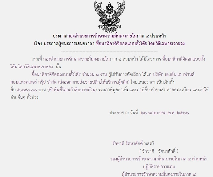 ประกาศผู้ชนะการเสนอราคา ซื้อนาฬิกาดิจิตอลแบบตั้งโต๊ะ โดยวิธีเฉพาะเจาะจง (5,490.00)