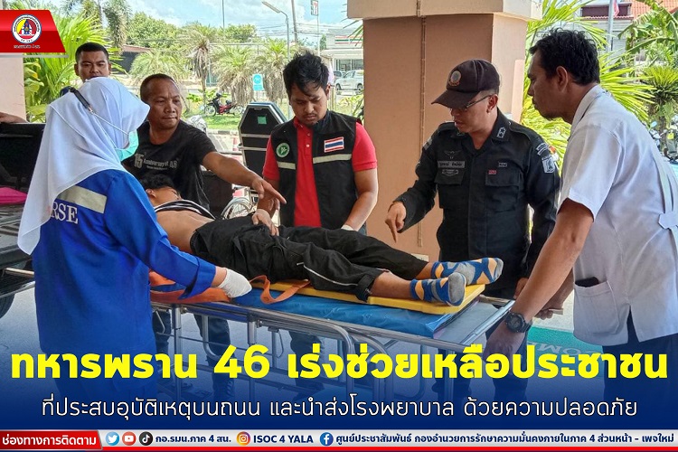 วันที่ 27 มิถุนายน 2566 เวลา 11.20 น. กองร้อยทหารพรานที่ 4608 หน่วยเฉพาะกิจกรมทหารพรานที่ 46 ร้อยโทจุลพงษ์ ทัพมีชัย ผู้บังคับกองร้อยทหารพรานที่ 4608 พร้อมด้วยกำลังพลของหน่วยฯ ได้เข้าช่วยเหลือประชาชนที่ประสบอุบัติเหตุรถจักรยานเสียหลักบริเวณเส้นทางโค้งบ้านสาวอ ตำบลสาวอ อำเภอรือเสาะ จังหวัดนราธิวาส ทราบชื่อคือ นายฟุรกอน สาหะ อายุ 16 ปี ภูมิลำเนา บ้านเลขที่ 59/7 หมู่ที่ 6 ตำบลสากอ อำเภอศรีสาคร จังหวัดนราธิวาส จึงได้นำส่งโรงพยาบาลรือเสาะเป็นที่เรียบร้อย ซึ่งขณะนี้อาการปลอดภัยแล้ว