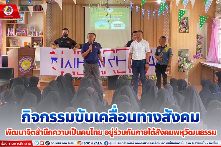 เมื่อวันที่ 27 มิถุนายน 2566 เวลา 15.00 น. ชุดสันติสุขที่ 305 ร่วมกับ ชุดทักษิณสัมพันธ์ที่ 301 หน่วยเฉพาะกิจสันติสุข ดำเนินกิจกรรมการขับเคลื่อนทางสังคม พัฒนาจิตสำนึกความเป็นคนไทย การอยู่ร่วมกันภายใต้สังคมพหุวัฒนธรรม ให้กับนักเรียนชั้นมัธยมศึกษาตอนต้น และตอนปลาย ณ โรงเรียนประทีปวิทยา บ้านบาตัน หมู่ที่ 4 ตำบลลิดล อำเภอเมือง จังหวัดยะลา ซึ่งได้ดำเนินกิจกรรม Mind Map ระดมความคิดในหัวข้อ “ฉันภูมิใจที่เกิดมาเป็นคนไทย”, ความภูมิใจในวิถีชีวิต, “ความภูมิใจในภาษา” และ “ความภูมิใจในธรรมเนียมประเพณี และวัฒนธรรม” พร้อมทั้งเชิญชวน ร่วมทำกิจกรรมคอนเทนต์ Wearethai อีกด้วย เสริมสร้างความรัก ความสามัคคีให้เกิดขึ้นในพื้นที่จังหวัดชายแดนภาคใต้อย่างยั่งยืน