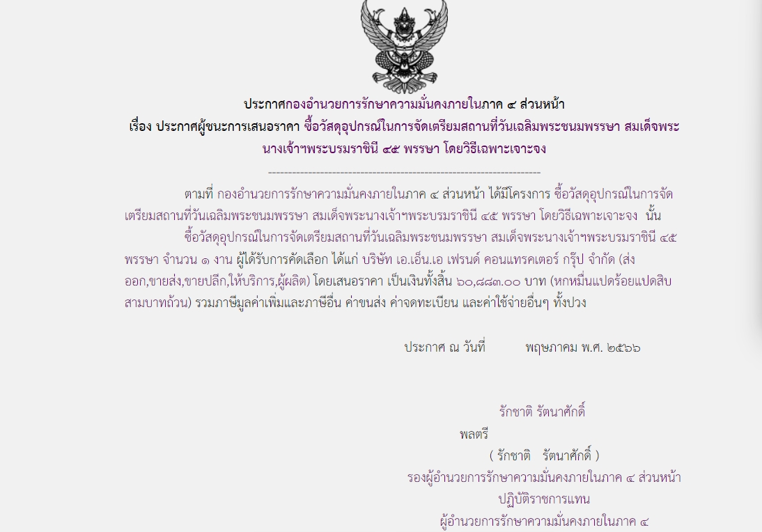 จัดซื้อ จัดจ้างประกาศผู้ชนะการเสนอราคา ประกาศผู้ชนะการเสนอราคา ซื้อวัสดุอุปกรณ์ในการจัดเตรียมสถานที่วันเฉลิมพระชนมพรรษา สมเด็จพระนางเจ้าพระบรมราชินี 45 พรรษา โดยวิธีเฉพาะเจาะจง (60,883.00 บาท) June 28, 2023 330 Share Facebook Twitter Google+ Telegram LINE