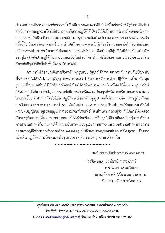 ด้านการไม่เลือกปฏิบัติทางเชื้อชาติในทุกรูปแบบ รัฐบาลได้กำหนดแนวทางในการแก้ไขปัญหาในพื้นที่ จชต. ให้เป็นไปตามอนุสัญญาระหว่างประเทศว่าด้วยการขจัดการเลือกปฏิบัติทางเชื้อชาติในทุกรูปแบบซึ่งประเทศไทยได้เข้าเป็นภาคีสมาชิกโดยได้ลงสัตยาบรรณและมีผลบังคับใช้ตั้งแต่ 27กุมภาพันธ์ 2546 โดยได้ให้ความสำคัญและตระหนักถึงการส่งเสริมและสนับสนุนสิทธิและเสรีภาพของปวงชนชาวไทยทุกเชื้อชาติ ศาสนา โดยไม่เลือกปฏิบัติทางเชื้อชาติในทุกรูปแบบทั้งด้านการเมือง เศรษฐกิจ สังคม การศึกษา ศาสนา กระบวนการยุติธรรม อัตลักษณ์ตลอดจนขนบธรรมเนียมประเพณีวัฒนธรรม เป็นไปตามบทบัญญัติของรัฐธรรมนูญแห่งราชอาณาจักรไทยเพื่อให้คนไทยสามารถอยู่ร่วมกันได้ภายใต้มิติของสังคมพหุวัฒนธรรมที่หลากหลาย นอกจากนี้ยังได้ส่งเสริมและสนับสนุนให้มีการศึกษาเรียนรู้ความเป็นมาทางประวัติศาสตร์ท้องถิ่นและได้พัฒนาเป็นแหล่งเรียนรู้และสถานที่ท่องเที่ยวเชิงประวัติศาสตร์เพื่อสร้างความภาคภูมิใจในรากเหง้าความเป็นมาและเชิดชูเกียรติของบรรพบุรุษโดยไม่เคยเข้าไปคุกคาม ขัดขวางหรือเลือกปฏิบัติต่อการจัดกิจกรรมในรูปแบบต่างๆที่ไม่ละเมิดกฎหมายแต่อย่างใด