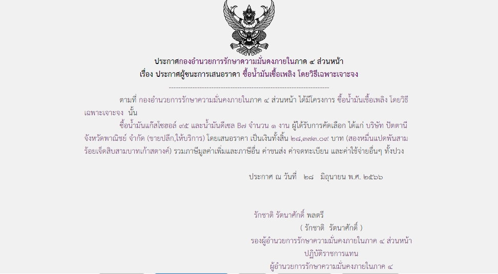 ประกาศผู้ชนะการเสนอราคา ซื้อน้ำมันเชื้อเพลิง โดยวิธีเฉพาะเจาะจง