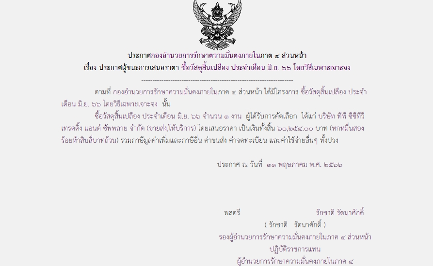 ประกาศผู้ชนะการเสนอราคา ซื้อวัสดุสิ้นเปลือง ประจำเดือน มิ.ย. ๖๖ โดยวิธีเฉพาะเจาะจง