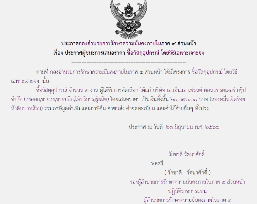 ประกาศผู้ชนะการเสนอราคา ซื้อวัสดุอุปกรณ์ โดยวิรีเฉพาะเจาะจง