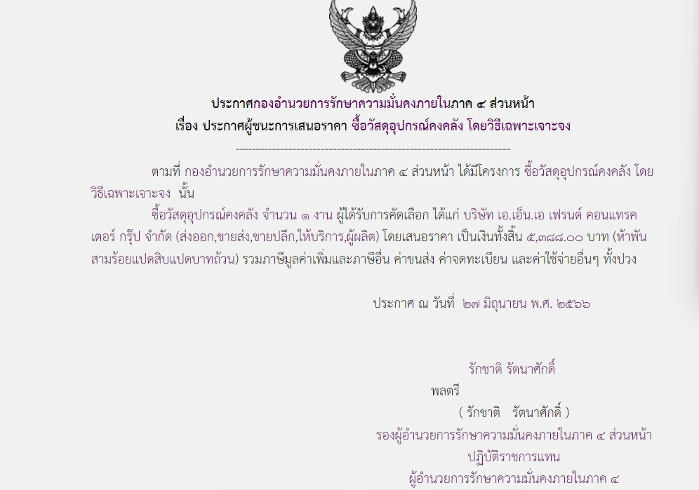 ประกาศผู้ชนะการเสนอราคา ซื้อวัสดุอุปกรณ์คงคลัง โดยวิรีเฉพาะเจาะจง