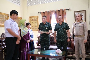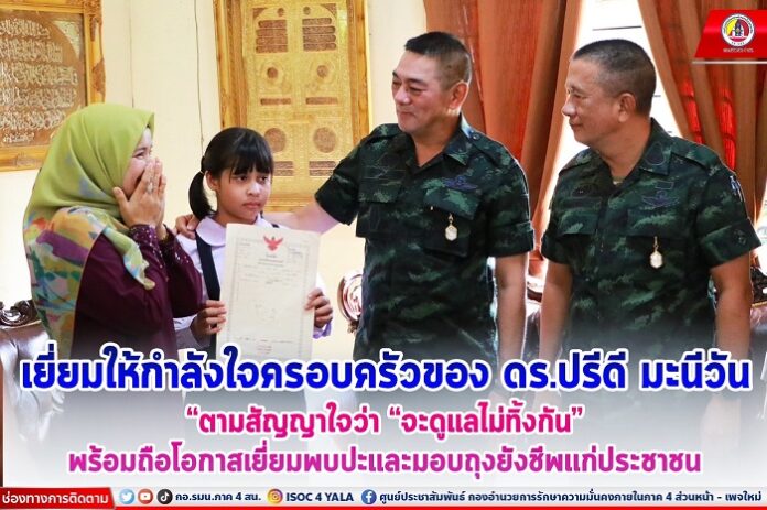 ภายหลังจากเยี่ยมให้กำลังใจ ครอบครัวของ ดร.ปรีดี มะนีวัน แม่ทัพภาคที่ 4 และรองแม่ทัพภาคที่ 4 พร้อมคณะ เดินเท้าเข้าชุมชมไปเยี่ยมประชาชนในละเเวกใกล้เคียงเพื่อพบปะและมอบถุงยังชีพแก่ประชาชน จำนวน 10 ครัวเรือน และแจกขนมแก่เด็กนักเรียนโรงเรียนชุมชนบ้านพงสตา ที่ต่างดีใจยิ้มขอบคุณรับขนมจากมือแม่ทัพภาคที่ 4 อย่างมีความสุข