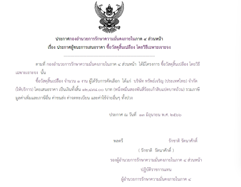 ประกาศผู้ชนะการเสนอราคา ซื้อวัสดุสิ้นเปลือง โดยวิรีเฉพาะเจาะจง