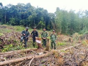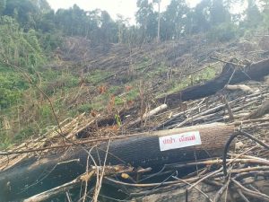แปลงที่ 5 ที่บนความสูงความสูงจากระดับน้ำทะเล 585 เมตร ตรวจพบพื้นที่ป่าไม้ถาวรถูกลักลอบตัดไม้ขนาดกลาง ขนาดเล็ก ด้วยเครื่องเลื่อยโซ่ยนต์จำนวนมาก และแผ้วถางป่าตัดฟันต้นไม้ขนาดเล็ก วัชพืช ไม้ไผ่ ไม้พื้นล่าง ด้วยมีดพร้าหรือขวาน มีการบั่นทอนไม้เป็นท่อนแล้วเผาทำลายบางส่วน ไม่ได้ตรวจวัดไม้ที่ถูกตัดโค่นแต่อย่างใด ถูกลักลอบทำลายมาแล้วประมาณ 8 เดือนจนถึงปัจจุบัน ตรวจวัดพื้นที่ป่าไม้เสียหาย จำนวน 5 ไร่ เพื่อยึดถือครองครองเพื่อทำการเกษตร ปลูกต้นทุเรียน ตรวจที่เกิดเหตุ พบอุปกรณ์ในการตัดไม้ทำลายป่า จำนวน 2 รายการ จึงตรวจยึดเป็นของกลาง ดังนี้ 1.มีดพร้า จำนวน 2 เล่ม 2.จอบ จำนวน 1 ด้าม