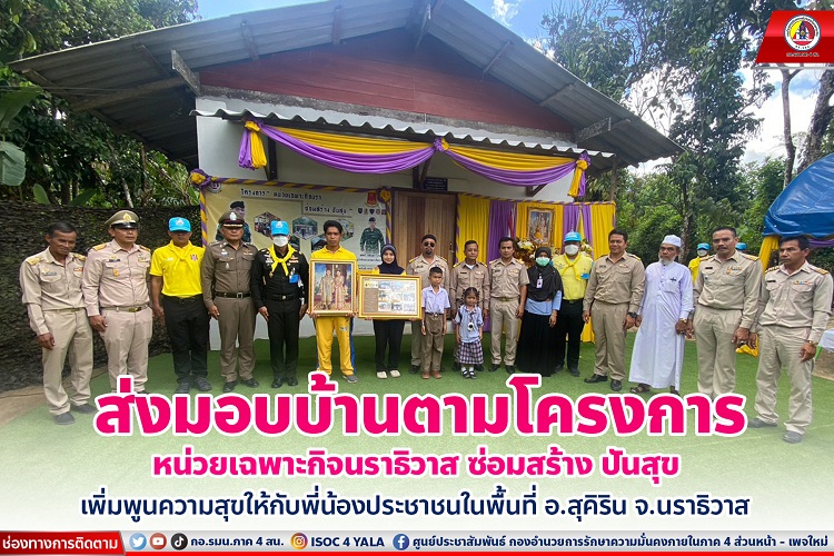 เมื่อวันที่ 10 กรกฎาคม 2566 เวลา 14.00 น. ที่บ้านเลขที่ 78 หมู่ที่ 1 ตำบลบางร่มไทร อำเภอสุคิริน จังหวัดนราธิวาส พลตรี เฉลิมพร ขำเขียว ผู้บัญชาการกองพลทหารราบที่ 15 / ผู้บังคับหน่วยเฉพาะกิจนราธิวาส ส่งมอบบ้าน ตามโครงการ ‘หน่วยเฉพาะกิจนราธิวาส ซ่อมสร้าง ปันสุข’ ให้กับ นายนิดี อับดุลรามัน ซึ่งเป็นประชาชนที่มีฐานะยากจน และที่ได้รับความเดือดร้อนในด้านที่อยู่อาศัย ชำรุดทรุดโทรม ที่ผ่านมาให้ความร่วมมือกับส่วนราชการ และหน่วยภาครัฐเป็นอย่างดีมาโดยตลอด เพื่อเป็นการพัฒนา ยกระดับคุณภาพชีวิต เสริมสร้างขวัญ และกำลังใจ เพิ่มพูนความสุขให้กับพี่น้องประชาชนในพื้นที่ จังหวัดนราธิวาส โดยมี นายอำเภอสุคิริน ผู้กำกับการสถานีตำรวจภูธรสุคิริน ผู้บังคับหน่วยเฉพาะกิจกรมทหารพรานที่ 49 นายกองค์การบริหารส่วนตำบลบางร่มไทร ผู้แทนส่วนราชการ กำนัน ผู้ใหญ่บ้าน อิหม่ามประจำตำบล หัวหน้าส่วนราชการ และพี่น้องประชาชน เข้าร่วมในพิธี