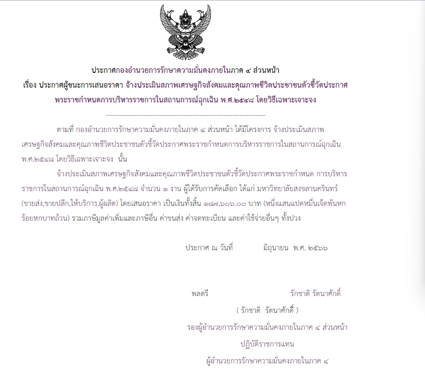จัดซื้อ จัดจ้างประกาศผู้ชนะการเสนอราคา ประกาศผู้ชนะการเสนอราคา จ้างประเมินสภาพเศรษฐกิจสังคมและคุณภาพชีวิตประชาชนตัวชี้วัดประกาศ พระราชกำหนดการบริหารราชการในสถานการณ์ฉุกเฉิน พ.ศ.๒๕๔๘ โดยวิธีเฉพาะเจาะจง July 12, 2023 454 Share Facebook Twitter Google+ Telegram LINE