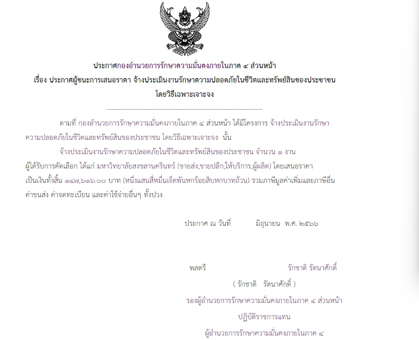 ประกาศผู้ชนะการเสนอราคา จ้างประเมินงานรักษาความปลอดภัยในชีวิตและทรัพย์สินของประชาชน โดยวิธีเฉพาะเจาะจง