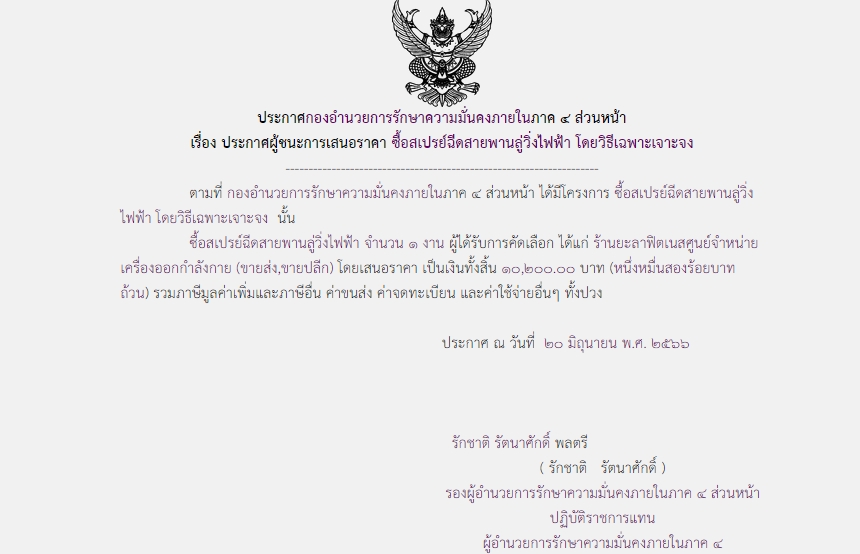 ประกาศผู้ชนะการเสนอราคา ซื้อสเปรย์ฉีดสายพานลู่วิ่งไฟฟ้า โดยวิธีเฉพาะเจาะจง