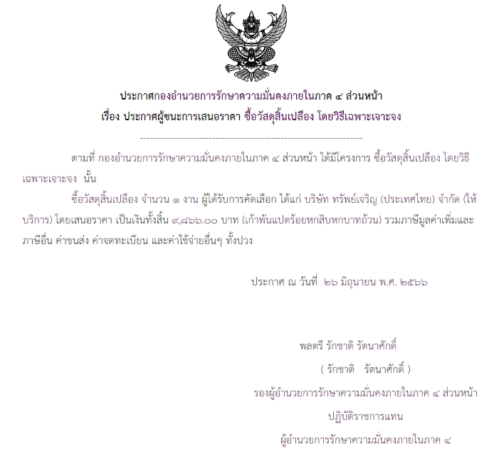 ประกาศผู้ชนะการเสนอราคา ซื้อวัสดุสิ้นเปลือง โดยวิธีเฉพาะเจาะจง