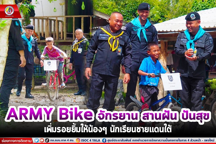 เมื่อวันที่ 15 กรกฎาคม 2566 เวลา 10.00 น. หน่วยเฉพาะกิจกรมทหารพรานที่ 45 จัดกำลังพล ลงพื้นที่อำเภอระแงะ จังหวัดนราธิวาส เพื่อมอบรถจักรยาน ตามโครงการ “จักรยาน สานฝัน ปันสุข” ให้กับนักเรียนในพื้นที่ เพื่อใช้ในการเดินทางไปเรียน จำนวน 2 คัน ซึ่งโครงการ “จักรยาน สานฝัน ปันสุข” เป็นไปตามนโยบายของผู้บัญชาการทหารบก ในเรื่องของการช่วยเหลือเด็ก ๆ นักเรียนที่ครอบครัวยากจน และอยู่ในพื้นที่ห่างไกล ได้มีจักรยานปั่นไปโรงเรียน โดยการนำจักรยานที่ชำรุดจากชุมชนในพื้นที่ มาดำเนินการซ่อมแซม ปรับปรุง ให้ได้มาตรฐานความปลอดภัย เพื่อส่งต่อโอกาสทางการศึกษา เพิ่มรอยยิ้ม เพิ่มความสุขให้น้องนักเรียนที่ยากจน ซึ่งตลอดโครงการที่ผ่านมา หน่วยเฉพาะกิจกรมทหารพรานที่ 45 ได้ดำเนินการส่งมอบจักรยานแล้ว จำนวน 271 คัน