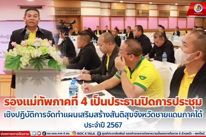 โอกาสนี้ พลตรี ไพศาล หนูสังข์ รองแม่ทัพภาคที่ 4 / รองผู้อำนวยการรักษาความมั่นคงภายในภาค 4 ส่วนหน้า กล่าวว่า การจัดทำ (ร่าง) แผนเสริมสร้างสันติสุขจังหวัดชายแดนภาคใต้ ประจำปี 2567 ของกองอำนวยการรักษาความมั่นคงภายในภาค 4 ส่วนหน้า มีความสำคัญเป็นอย่างมาก เพื่อทำให้การแก้ไขปัญหาความไม่สงบในพื้นที่จังหวัดชายแดนภาคใต้ มีความสอดคล้องกับสถานการณ์ในปัจจุบัน ให้แก้ไขปัญหาได้อย่างมีประสิทธิภาพ และการประชุมเชิงปฏิบัติฯ ในครั้งนี้ เพื่อให้หน่วยในโครงสร้างและส่วนราชการที่เกี่ยวข้องภายใต้แผนบูรณาการ การแก้ไขปัญหาจังหวัดชายแดนภาคใต้ เป็นกรอบแนวทางการปฏิบัติงานแก้ไขปัญหา บังเกิดผลสัมฤทธิ์เป็นรูปธรรม และนำไปสู่การแก้ไขปัญหาความไม่สงบได้อย่างแท้จริง เพื่อให้ประชาชนสามารถใช้วิถีชีวิตได้ตามปกติได้