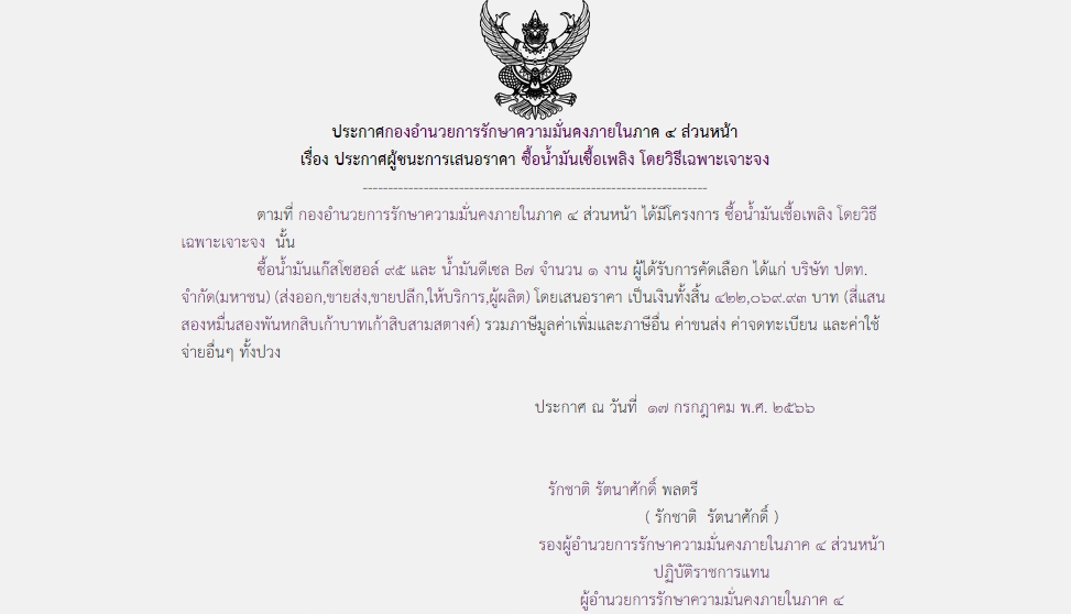 ประกาศผู้ชนะการเสนอราคา ซื้อน้ำมันเชื้อเพลิง โดยวิธีเฉพาะเจาะจง
