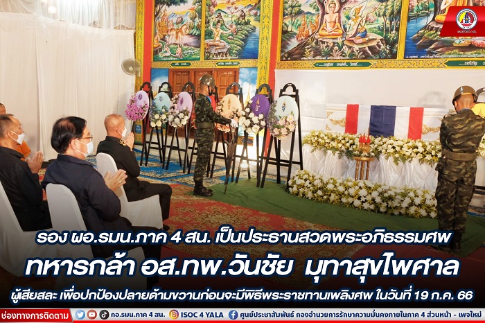 เมื่อวันที่ 18 กรกฎาคม 2566 พลตรี กรกฎ ภู่โชติ รองผู้อำนวยการรักษาความมั่นคงภายในภาค 4 ส่วนหน้า ผู้แทน พลโท ศานติ ศกุนตนาค แม่ทัพภาคที่ 4 / ผู้อำนวยการรักษาความมั่นคงภายในภาค 4 เดินทางเป็นประธานสวดพระอภิธรรมศพ อาสาสมัครทหารพราน วันชัย มุทาสุขไพศาล ซึ่งเสียชีวิตจากการปฏิบัติหน้าที่ในพื้นที่จังหวัดชายแดนภาคใต้ ที่วัดหนองมะจับ บ้านหนองมะจับ ตำบลแม่แฝก อำเภอสันทราย จังหวัดเชียงใหม่ ท่ามกลางบรรยากาศความเสียใจของญาติพี่น้อง และเพื่อน ๆ ที่มาร่วมงาน