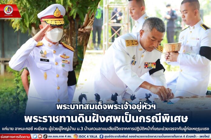เมื่อวันที่ 20 กรกฎาคม 2566 เวลา 09.30 น. ที่ กุโบร์บ้านควนลาแม หมู่ที่ 3 ตำบลนาเกตุ อำเภอโคกโพธิ์ จังหวัดปัตตานี พระบาทสมเด็จพระปรเมนทรรามาธิบดีศรีสินทร มหาวชิราลงกรณ พระวชิรเกล้าเจ้าอยู่หัว ทรงพระกรุณาโปรดเกล้าฯ พระราชทานดินฝังศพเป็นกรณีพิเศษ แก่นาย อาหมะกอซี หะยีเลาะ ผู้ช่วยผู้ใหญ่บ้าน หมู่ที่ 3 บ้านควนลาแม ตำบลนาเกตุ อำเภอโคกโพธิ์ จังหวัดปัตตานี ที่ได้เสียชีวิตจากการปฎิบัติหน้าที่ขณะเข้าบังคับใช้กฏหมายต่อผู้ต้องสงสัยและช่วยเข้าเจรจาให้ผู้ก่อเหตุรุนแรงหวังมอบตัว แต่คนร้ายกลับยิงปืนใส่เจ้าหน้าที่ทำให้เกิดเหตุการณ์ยิงต่อสู้ขึ้นเป็นเหตุให้นายอาหมะกอซี หะยีเลาะ ผู้ช่วยผู้ใหญ่บ้าน หมู่ที่ 3 บ้านควนลาแม ถูกคนร้ายยิงเสียชีวิตในระหว่างปฏิบัติหน้าที่ เมื่อวันที่ 4 กรกฎาคม 2566 รวมอายุ 46 ปี โดยมี นายสนั่น สนธิเมือง รองผู้ว่าราชการจังหวัดปัตตานี เป็นประธานในพิธีฯ พลตรี กรกฎ ภู่โชติ รองผู้อำนวยการรักษาความมั่นคงภายในภาค 4 ส่วนหน้า พร้อมด้วยข้าราชการ ทหาร ตำรวจ ฝ่ายปกครอง ญาติ และครอบครัวของผู้เสียชีวิตร่วมในพิธี