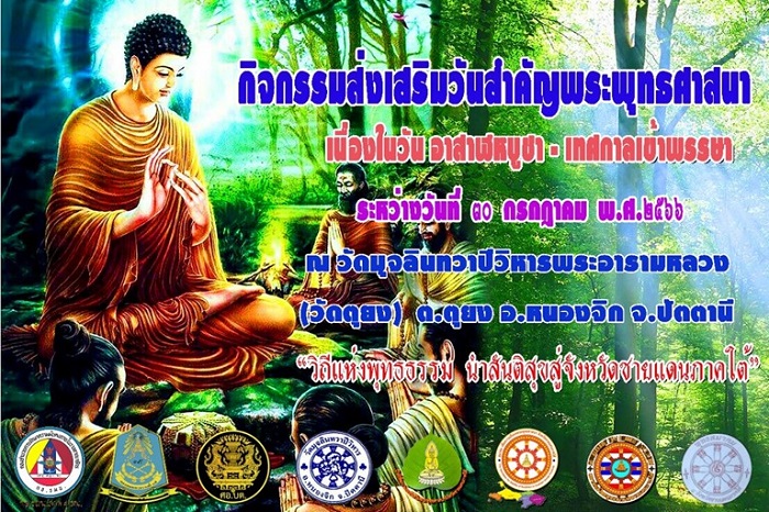 กองอำนวยการรักษาความมั่นคงภายในภาค 4 ส่วนหน้า, ศูนย์ประสานงานโครงการอันเนื่องมาจากพระราชดำริ, ศูนย์อำนวยการบริหารจังหวัดชายแดนภาคใต้, ศูนย์สันติวิธี, ศูนย์พัฒนาส่งเสริมพระพุทธศาสนาจังหวัดชายแดนภาคใต้ (ศสพ.จชต.), สมาคมเพื่อความมั่นคงพระพุทธศาสนาจังหวัดชายแดนภาคใต้ (มพส.จชต.), สมาพันธ์ไทยพุทธจังหวัดชายแดนภาคใต้และหน่วยงานที่เกี่ยวข้อง ร่วมกันจัดกิจกรรมส่งเสริมพระพุทธศาสนา “วันอาสาฬหบูชา” ประจำปี พ.ศ. 2566 เพื่อส่งเสริมวันสำคัญพระพุทธศาสนา และสืบทอดประเพณีวัฒนธรรมอันดีงามของชาวพุทธ รวมทั้งจรรโลงความมั่นคงของพระพุทธศาสนาในพื้นที่จังหวัดชายแดนภาคใต้สืบไป โดยจัดขึ้นในวันที่ 30 กรกฎาคม 2566 ณ วัดมุจลินทวาปีวิหาร พระอารามหลวง (วัดตุยง) ตำบลตุยง อำเภอหนองจิก จังหวัดปัตตานี จึงขอเชิญชวนพุทธศาสนิกชนร่วมงาน และร่วมอนุโมทนาบุญในครั้งนี้