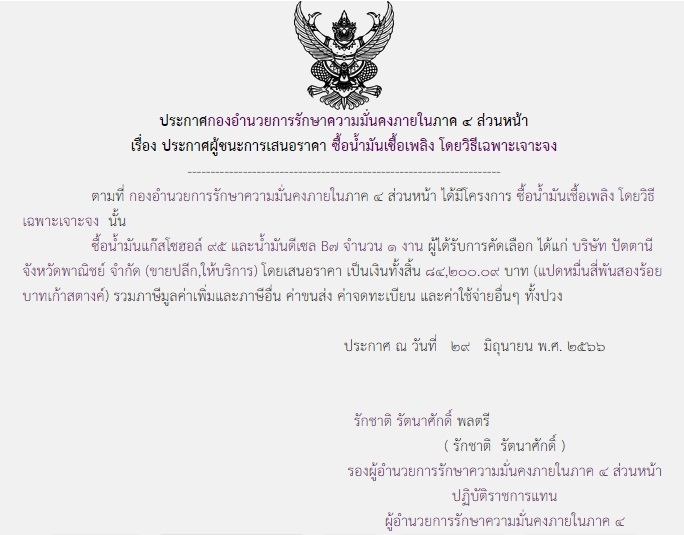 ประกาศผู้ชนะการเสนอราคา ซื้อน้ำมันเชื้อเพลิง โดยวิธีเฉพาะเจาะจง (84,200.09 บาท)