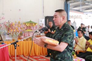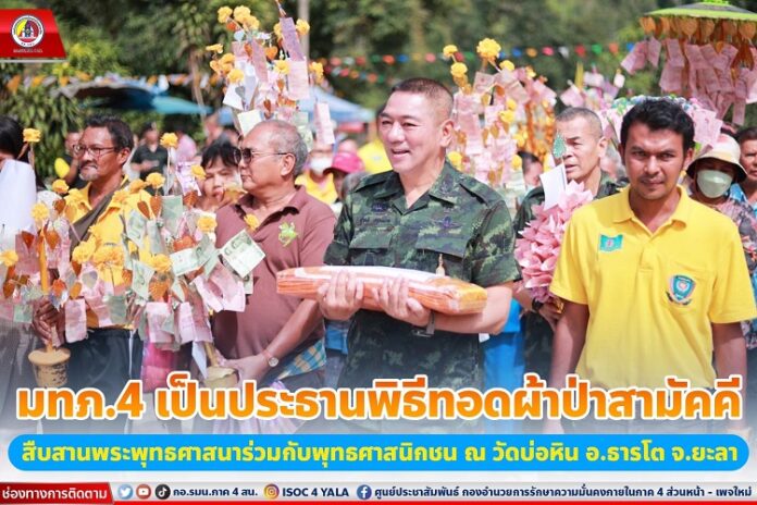 วันนี้ 22 กรกฎาคม 2566 เวลา 10.00 น. ที่ วัดบ่อหิน ต.บ้านแหร อำเภอธารโต จังหวัดยะลา พลโท ศานติ ศกุนตนาค แม่ทัพภาคที่ 4 / ผู้อำนวยการรักษาความมั่นคงภายในภาค 4 เป็นประธานในพิธีทอดผ้าป่าสามัคคี ประจำปี 2566 เพื่อบูรณะซ่อมแซมกุฏิสงฆ์ ที่ชำรุดทรุดโทรม จำนวน 5 หลัง พร้อมทั้งปรับปรุงซ่อมแซมระบบสายไฟใหม่ โดยมี พระเกษียร จารุวัณโณ เจ้าอาวาสวัดบ่อหิน พร้อมด้วยคณะผู้บังคับบัญชา หัวหน้าส่วนราชการ และพุทธศาสนิกชนผู้มีจิตศรัทธาเข้าร่วมพิธีอย่างพร้อมเพรียง ซึ่งปัจจัยที่รวบรวมได้จากบริวารกฐินผู้มีจิตศรัทธาในครั้งนี้ มียอดรวมทั้งสิ้น 159,525 บาท ในการนี้ วัดบ่อหิน จะนำไปทำนุบำรุง บูรปฏิสังขรณ์ศาสนสถานที่ชำรุดเสียหายภายในวัด เพื่อเป็นศูนย์รวมจิตใจแก่พุทธศาสนิกชนในพื้นที่