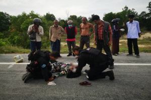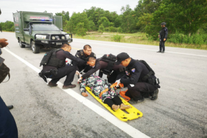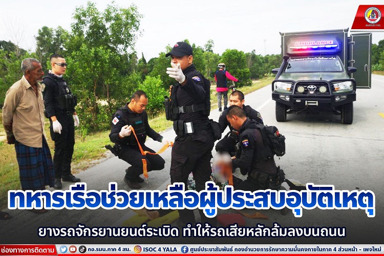 เมื่อวันที่ 21 กรกฎาคม 2566 เวลา 08.45 น. ขณะที่กำลังพลของกองร้อยทหารพรานนาวิกโยธินที่ 8 หน่วยเฉพาะกิจทหารพรานนาวิกโยธินกองทัพเรือ กำลังเดินทางไปฝึกยิงอาวุธด้วยกระสุนจริง ณ สนามยิงปืนค่ายจุฬาภรณ์ ในระหว่างเดินทาง ได้พบเห็นประชาชนประสบอุบัติเหตุยางรถจักรยานยนต์ระเบิด ทำให้รถเสียหลักล้มลงบนถนนหมายเลข 4066 ระหว่าง บ้านฮูแตยือลอ – สนามบินนราธิวาส อำเภอยี่งอ จังหวัดนราธิวาส เป็นเหตุให้ภรรยาซึ่งเป็นผู้ซ้อนได้รับบาดเจ็บสาหัส ตรวจพบ กะโหลกศีรษะร้าว มีเลือดออกตามจมูก ปาก และหู หมดสติ ณ ที่เกิดเหตุฯ ส่วนสามีผู้เป็นคนขับได้รับบาดเจ็บเล็กน้อย เนื่องจากสวมหมวกนิรภัย พันจ่าโท กิตติศักดิ์ ปทุมรักษ์ เจ้าหน้าที่พยาบาลกองร้อยฯ ซึ่งเป็นผู้ควบคุมรถ จึงได้สั่งหยุดรถและดำเนินเข้าช่วยเหลือปฐมพยาบาลเบื้องต้น และนำส่งโรงพยาบาลนราธิวาส เพื่อทำการรักษาต่อไป
