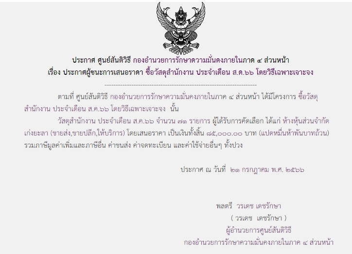 ประกาศผู้ชนะการเสนอราคา ซื้อวัสดุสำนักงาน ประจำเดือน ส.ค.66 โดยวิธีเฉพาะเจาะจง (85,000.00บาท)