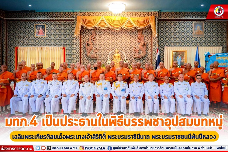 สำหรับพิธีบรรพชาอุปสมบทหมู่เฉลิมพระเกียรติสมเด็จพระนางเจ้าสิริกิติ์ พระบรมราชินีนาถ พระบรมราชชนนีพันปีหลวง ประจำปีพุทธศักราช 2566 กองอำนวยการรักษาความมั่นคงภายในภาค 4 ส่วนหน้า โดยศูนย์ประสานงานโครงการอันเนื่องมาจากพระราชดำริ ได้จัดโครงการบรรพชาอุปสมบทเฉลิมพระเกียรติขึ้นในจังหวัดชายแดนภาคใต้ ตามพระราชเสาวนีย์สมเด็จพระนางเจ้าสิริกิติ์ พระบรมราชินีนาถ พระบรมราชชนนีพันปีหลวง ที่มีพระราชปณิธานแน่วแน่ ที่จะทรงทำนุบำรุงพระพุทธศาสนาให้ดำรงคงมั่นอยู่ในพื้นที่จังหวัดชายแดนภาคใต้เป็นที่พึ่งทางใจของชาวไทยที่นับถือพระพุทธศาสนา จรรโลงพระพุทธศาสนาในพื้นที่จังหวัดชายแดนภาคใต้ ตลอดจนเพื่อถวายเป็นพระราชกุศลแด่พระบาทสมเด็จพระปรเมนทร รามาธิบดี ศรีสินทร มหาวชิราลงกรณ พระวชิรเกล้าเจ้าอยู่หัว และสมเด็จพระนางเจ้าสิริกิติ์ พระบรมราชินีนาถ พระบรมราชชนนีพันปีหลวง รวมทั้งให้ผู้มีจิตศรัทธาที่เข้าร่วมอุปสมบทจำพรรษาได้ประกอบพิธีกรรมทางพระพุทธศาสนา ทดแทนพระคุณบุพการี สืบสาน รักษา และต่อยอดตามพระปฐมบรมราชโองการของพระบาทสมเด็จพระปรเมนทรรามาธิบดี ศรีสินทร มหาวชิราลงกรณ พระวชิรเกล้าเจ้าอยู่หัว รัชกาลที่ 10