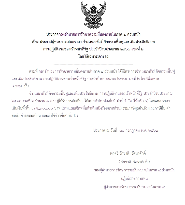 จัดซื้อ จัดจ้างประกาศผู้ชนะการเสนอราคา ประกาศผู้ชนะการเสนอราคา จ้างเหมาทัวร์ กิจกรรมฟื้นฟูและเพิ่มประสิทธิภาพการปฎิบัติงานของเจ้าหน้าที่รัฐ ประจำปีงบประมาณ 2566 งวดที่ 2 โดยวิธีเฉพาะเจาะจง (375,100.00บาท) July 26, 2023 515 Share Facebook Twitter Google+ Telegram LINE