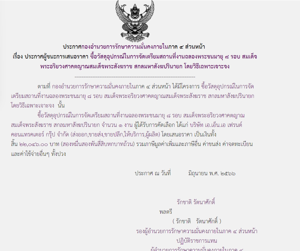 จัดซื้อ จัดจ้างประกาศผู้ชนะการเสนอราคา ประกาศผู้ชนะการเสนอราคา ซื้อวัสดุอุปกรณ์ในการจัดเตรียมสถานที่ฉลองพระชนมายุ 8 รอบ สมเด็จพระอริยะวงศาคตญาณสมเด็จพระสังฆราช สกลมหาสังฆปรินายก โดยวิธีเฉพาะเจาะจง (22,046.00บาท) July 26, 2023 539 Share Facebook Twitter Google+ Telegram LINE