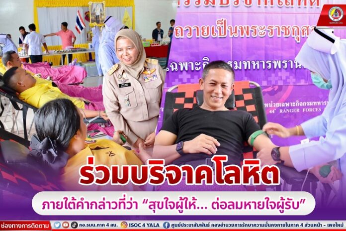 เมื่อวันที่ 25 กรกฎาคม 2566 เวลา 09.30 น. พันเอก ภาคภูมิ จันทรักษ์ ผู้บังคับหน่วยเฉพาะกิจกรมทหารพรานที่ 44 จัดกำลังพล ร่วมใจกันบริจาคโลหิต ถวายเป็นพระราชกุศลแด่ พระบาทสมเด็จพระปรเมนทรรามาธิบดีศรีสินทรมหาวชิราลงกรณ พระวชิรเกล้าเจ้าอยู่หัว (รัชกาลที่ 10) เนื่องในโอกาสวันเฉลิมพระชนมพรรษา วันที่ 28 กรกฎาคม 2566 โดย สำนักงานเหล่ากาชาดจังหวัดปัตตานี ได้เข้ามาดำเนินการรับโลหิต ณ กองบังคับการหน่วยเฉพาะกิจกรมทหารพรานที่ 44 ตำบลปะเสยะวอ อำเภอสายบุรี จังหวัดปัตตานี เพื่อนำโลหิตที่ได้รับจากการบริจาคในครั้งนี้ ไปช่วยเหลือพี่น้องประชาชน และผู้ป่วยที่มีความต้องการ ตามโรงพยาบาล สถานพยาบาลต่างๆ ในพื้นที่จังหวัดชายแดนภาคใต้ ภายใต้คำกล่าวที่ว่า “สุขใจผู้ให้… ต่อลมหายใจผู้รับ”