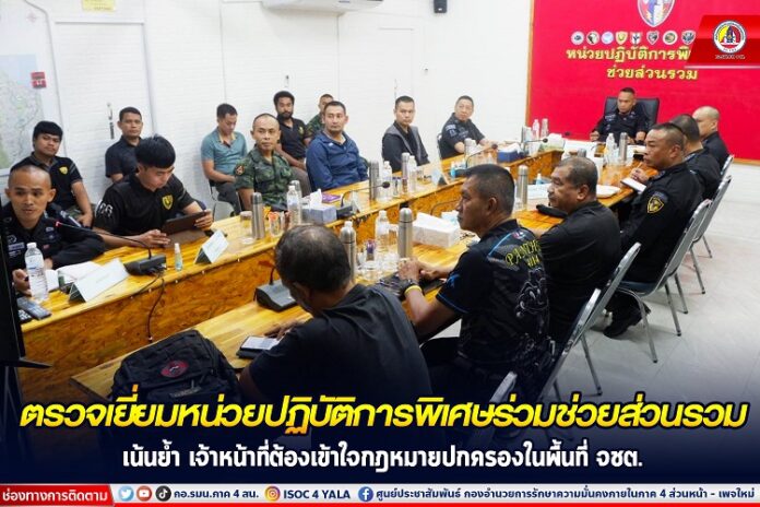 วันที่ 28 กรกฎาคม 2566 เวลา 1030 น. ที่ กองบังคับการหน่วยปฏิบัติการร่วมช่วยส่วนรวม หน่วยเฉพาะกิจกรมทหารพรานที่ 41 ตำบลวังพญา อำเภอรามัน จังหวัดยะลา พันเอก สฐิรพงษ์ ผู้บังคับการหน่วยปฏิบัติการพิเศษร่วม/ผู้บังคับกองกำลังทหารพรานจังหวัดชายแดนภาคใต้ พร้อมด้วย พันเอก สิทธิศักดิ์ เจนบรรจง รองผู้บังคับหน่วยปฏิบัติการพิเศษร่วม/รองผู้บังคับกองกำลังทหารพรานจังหวัดชายแดนภาคใต้ และ พันเอก ธีรนัย ฉายสุวรรณ์ เสนาธิการกองกำลังทหารพรานจังหวัดชายแดนภาคใต้ ลงพื้นที่ตรวจเยี่ยมการปฏิบัติงานของหน่วยปฏิบัติการร่วมช่วยส่วนรวม เพื่อติดตามผลการปฏิบัติงาน และประชุมหารือทบทวนขั้นตอนการปฏิบัติในการเข้าบังคับใช้กฎหมายในพื้นที่จังหวัดชายแดนภาคใต้ ให้เป็นไปตามหลักสิทธิมนุษยชน รับทราบปัญหา และแนวทางในการบังคับใช้กฎหมายเพื่อไม่ให้เกิดความสูญเสีย และเกิดเงื่อนไขในการปฏิบัติของหน่วย โดยมี พันเอก พงศกร แสงกุล ผู้บังคับหน่วยปฏิบัติการพิเศษร่วมช่วยส่วนรวม, พันเอก กฤษณะ น้ำแก้ว ผู้บังคับหน่วยเฉพาะกิจกรมทหารพรานที่ 30 และเจ้าหน้าที่หน่วยปฏิบัติการพิเศษร่วม ประจำจังหวัดปัตตานี เข้าร่วมประชุม