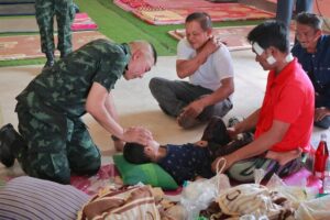 จากนั้น แม่ทัพภาคที่ 4 และคณะฯ ไปยังโรงพยาบาลสุไหงโก-ลก จังหวัดนราธิวาส เพื่อเยี่ยมผู้ได้รับเจ็บจากเหตุโกดังเก็บประทัดและดอกไม้ไฟ ระเบิด ที่ได้รักษาตัวอยู่โรงพยาบาล จำนวน 10 ราย มีทั้ง เด็ก ผู้ใหญ่ และผู้สูงอายุ ทั้งนี้ ได้สอบถามอาการ พร้อมสร้างขวัญและเยียวยาจิตใจ ทั้งนี้ ทุกส่วนทั้งภาครัฐ ภาคเอกชน ภาคประชาชน ยังได้ระดมสรรพกำลังร่วมกันบริจาคโลหิต และตั้งศูนย์บัญชาการเหตุการณ์ให้ความช่วยเหลือ เพื่อช่วยเหลือผู้ประสบเหตุดังกล่าว รวมทั้ง ยังได้เตรียมการวางแผนในการช่วยเหลือฟื้นฟู ซ่อมแซม ปรับปรุงบ้านพักอาศัยของผู้ประสบภัยหลัง สำหรับสาเหตุของการเกิดระเบิดอยู่ในระหว่างการเก็บรวบรวมข้อมูลต่อไป