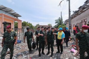 ล่าสุดวันนี้ (30 กรกฏภาคม 2566 ) พลโท ศานติ ศกุนตนาค แม่ทัพภาคที่ 4 / ผู้อำนวยการรักษาความมั่นคงภายในภาค 4 พร้อมด้วย พลตรี ไพศาล หนูสังข์ รองแม่ทัพภาคที่ 4 / รองผู้อำนวยการรักษาความมั่นคงภายในภาค 4 ส่วนหน้า และ พลตรี กรกฎ ภู่โชติ รองผู้อำนวยการรักษาความมั่นคงภายในภาค 4 ส่วนหน้า ลงพื้นที่เกิดเหตุโกดังเก็บประทัดและดอกไม้ไฟ ระเบิด ในพื้นที่ ตำบลมูโนะ อำเภอสุไหงโก-ลก จังหวัดนราธิวาส ร่วมกับ พลตำรวจตรี อนุรุธ อิ่มอาบ ผู้บังคับการตำรวจภูธรจังหวัดนราธิวาส , นายสนั่น พงษ์อักษร ผู้ว่าราชการจังหวัดนราธิวาส, พลตรี เฉลิมพร ขำเขียว ผู้บังคับหน่วยเฉพาะกิจนราธิวาส, นายแพทย์ เอกวิทย์ จินดาเพ็ชร รองนายแพทย์สาธารณสุขจังหวัดนราธิวาส, นายอนิรุทร บัวอ่อน นายอำเภอสุไหงโก-ลก เพื่อตรวจสอบความเสียหาย หารือแนวทางการช่วยเหลืออย่างเร่งด่วน พร้อมสั่งการหน่วยทหารในพื้นที่ให้นำเครื่องมือ ยานพาหนะ และอุปกรณ์ยังชีพต่าง ๆ เร่งดำเนินการเข้าให้ความช่วยเหลือประชาชนทันที โดยข้อมูลล่าสุดนั้น มีผู้เสียชีวิต 9 ราย รอพิสูจน์ฯ 2 ราย และได้รับบาดเจ็บ 111 ราย