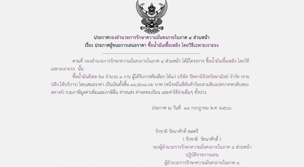 จัดซื้อ จัดจ้างประกาศผู้ชนะการเสนอราคา ประกาศผู้ชนะการเสนอราคา ซื้อน้ำมันเชื้อเพลิง โดยวิธีเฉพาะเจาะจง July 30, 2023 281 Share Facebook Twitter Google+ Telegram LINE