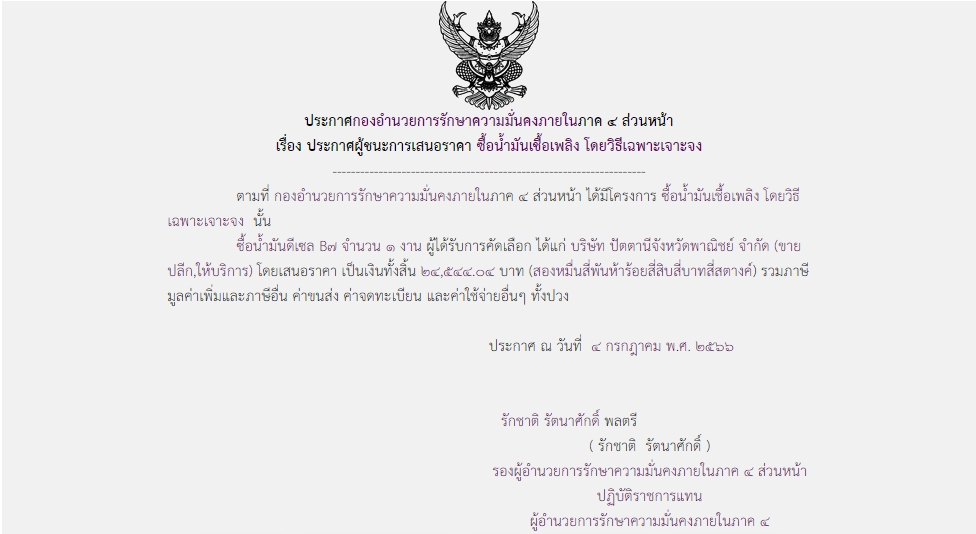 ประกาศผู้ชนะการเสนอราคา ซื้อน้ำมันเชื้อเพลิง โดยวิธีเฉพาะเจาะจง