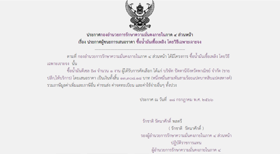 จัดซื้อ จัดจ้างประกาศผู้ชนะการเสนอราคา ประกาศผู้ชนะการเสนอราคา ซื้อน้ำมันเชื้อเพลิง โดยวิธีเฉพาะเจาะจง July 30, 2023 348 Share Facebook Twitter Google+ Telegram LINE