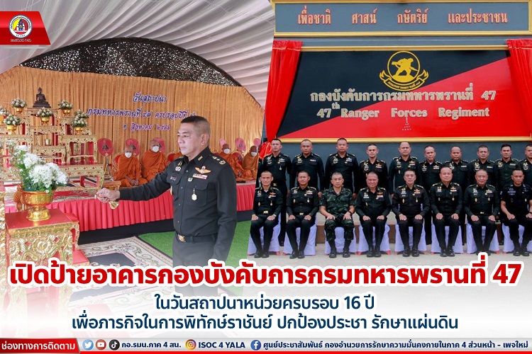 วันนี้ 1 สิหาคม 2566 เวลา 10.00 น. พลโท ศานติ ศกุนตนาค แม่ทัพภาคที่ 4 เดินทางเป็นประธานในพิธีครบรอบ 16 ปี วันสถาปนากรมทหารพรานที่ 47 เพื่อเป็นการเชิดชูเกียรติรำลึกถึงวันสำคัญของหน่วย และบำเพ็ญกุศลอุทิศให้กับกำลังพลที่เสียชีวิตจากการปฏิบัติหน้าที่ราชการ เพื่อปกป้องอธิปไตยของประเทศชาติ รักษาความสงบเรียบร้อยให้กับพี่น้องประชาชน อีกทั้งเพื่อความเป็นสิริมงคลให้แก่กำลังพลและครอบครัว